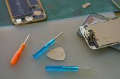Zdjęcie "Zbliżenie z A ludzka ręka naprawy Smartphone z Screwdriver.Internal układy i elementy konstrukcyjne telefonów komórkowych. Naprawa telefonów komórkowych i tabletów przez wykwalifikowanych techników. Doświadczonych testerów i check telefonów. Przed i po naprawie" może być wykorzystywane do celów osobistych i komercyjnych zgodnie z warunkami zakupionej licencji Royalty-free. Obraz jest dostępny do pobrania w jakości wysokiej rozdzielczości do 5760x3840.