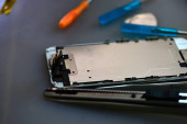 Zbliżenie z A ludzka ręka naprawy Smartphone z Screwdriver.Internal układy i elementy konstrukcyjne telefonów komórkowych. Naprawa telefonów komórkowych i tabletów przez wykwalifikowanych techników. Doświadczonych testerów i check telefonów. Przed i po naprawie