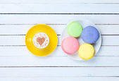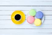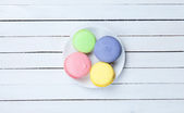 Kolorowe makaroniki na białym tle drewnianych.
