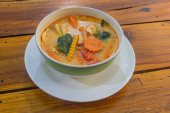 Zdjęcie "Świeże, przygotowane Ringgit mnie zupa z makaronem Bandung serwowane w lokalnej restauracji na wyspie Pangkor. Tradycyjne dania kuchni azjatyckiej, wykonane ze świeżych składników." może być wykorzystywane do celów osobistych i komercyjnych zgodnie z warunkami zakupionej licencji Royalty-free. Obraz jest dostępny do pobrania w jakości wysokiej rozdzielczości do 5760x3840.