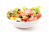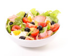 Pyszne sałatki świeże danie na talerzu biały na białym tle. Zdrowe odżywianie sceny, świeża sałata, pomidory, tuńczyk, ogórek, grzanka lub grzankami i oliwki w misce.