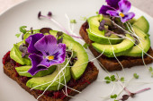 awokado, ogórek, słonecznik kiełkować i jadalne kwiaty na zakwasie grzanki