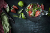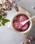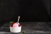 Zdjęcie "Cherry ice cream scoop w misce, jagody świeże wiśni i kwiaty na ciemnozielonym z miejsca kopii. " może być wykorzystywane do celów osobistych i komercyjnych zgodnie z warunkami zakupionej licencji Royalty-free. Obraz jest dostępny do pobrania w jakości wysokiej rozdzielczości do 5760x3840.