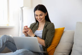Zdjęcie "Młoda kobieta pracująca z laptopem w domu" może być wykorzystywane do celów osobistych i komercyjnych zgodnie z warunkami zakupionej licencji Royalty-free. Obraz jest dostępny do pobrania w jakości wysokiej rozdzielczości do 5760x3840.