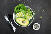 Wegetariańskie warzyw lato awokado mikro zieleni miski. Widok z góry.