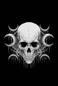Zdjęcie "Ilustracja biały uśmiech czaszki z rogami. Na białym tle obraz na czarnym tle. Okładka albumu, książki i strony. Devil's obrazu. Iluzja na plakat. Szkic 2d malarstwo cyfrowe." może być wykorzystywane do celów osobistych i komercyjnych zgodnie z warunkami zakupionej licencji Royalty-free. Obraz jest dostępny do pobrania w jakości wysokiej rozdzielczości do 5760x3840.