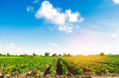 Na polu rosną warzywne rzędy pieprzu. rolnictwo, rolnictwo. Krajobraz z gruntami rolnymi