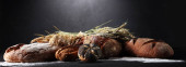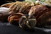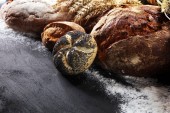 Różne rodzaje chleba i chleb bułki na pokładzie z góry. Projekt plakatu lub piekarni.