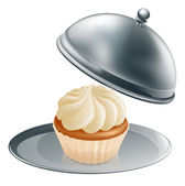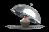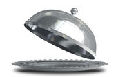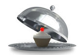 otworzyć metal srebrny talerz lub cloche-ciasto creme fraiche i wiśnia 3d render wysokiej rozdzielczości