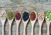 Fasola i soczewica w drewnianą łyżką z białym malowane na tle drewna. orzeszków ziemnych, orzechów włoskich, macadamia, migdałów, soja, czerwonej fasoli, czarnej fasoli, sezam, kukurydza i brązowy fasola pinto