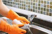 Zdjęcie "Zbliżenie z rąk w rękawicach gumowych mycia naczyń z gąbki. Pojęcie pracy w domu" może być wykorzystywane do celów osobistych i komercyjnych zgodnie z warunkami zakupionej licencji Royalty-free. Obraz jest dostępny do pobrania w jakości wysokiej rozdzielczości do 5760x3840.