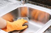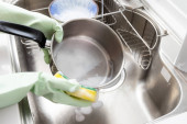 Zbliżenie z rąk w rękawicach gumowych mycia naczyń z gąbki. Pojęcie pracy w domu