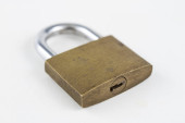 Mosiądz kłódką na stół biały. Akcesoria do blokowania i zabezpieczenia przed włamaniem. Białe tło.