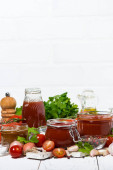 asortyment sosy pomidorowe i składniki na białym tle, zbliżenie poziome