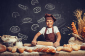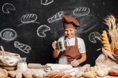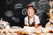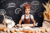 Uroczy dziewczynka w fartuch i czapkę stoi przy stole, wyrabiania ciasta chlebowego