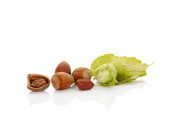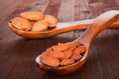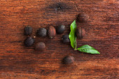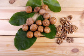Orzechy nerkowca z liści na drewnianym stole z góry.