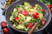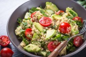 Zdjęcie "Sałatka quinoa z szpinak, awokado i pomidory" może być wykorzystywane do celów osobistych i komercyjnych zgodnie z warunkami zakupionej licencji Royalty-free. Obraz jest dostępny do pobrania w jakości wysokiej rozdzielczości do 5760x3840.
