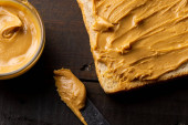 Toast chleb z masłem orzechowym na talerzu, zbliżenie