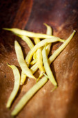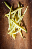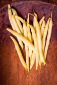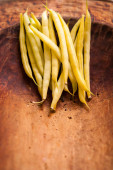 wizerunek garść surowego żółto zielona fasolka szparagowa na ciemno brązowy powierzchni drewnianych
