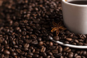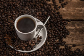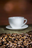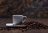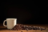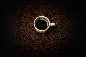 Ceramiczne białe filiżankę parze napój na sterty czarny palonych ziaren kawy, czarnym tle