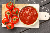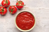 Miski i łyżka z sosem pomidor smaczny na stole, zbliżenie