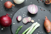 Inne świeże cebula z przyprawami na podłoże drewniane