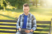 Przystojny mężczyzna z telefonu komórkowego na ławce w parku
