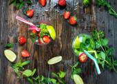 Szklany dzbanek z pyszne lemoniady truskawek na drewnianym stole