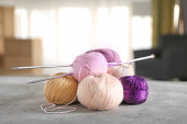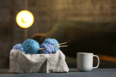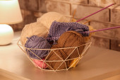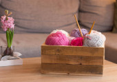 Przędza dziewiarskie kolorowe na drewnianej skrzyni w pokoju
