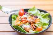 Zdjęcie "Miska z pyszne świeże sałatki na drewnianym stole" może być wykorzystywane do celów osobistych i komercyjnych zgodnie z warunkami zakupionej licencji Royalty-free. Obraz jest dostępny do pobrania w jakości wysokiej rozdzielczości do 5760x3840.
