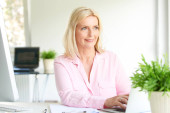 Piękny podeszłym wieku kobieta robi troche papierkowej roboty i pisania coś siedząc przy biurku i za pomocą jej laptop.