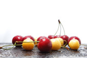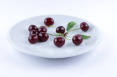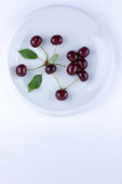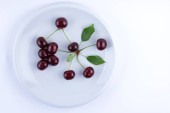 Na białym tle czerwone wiśnie na białym talerzu, świeże wiśnie z zielonych liści, czerwone jagody w stylu minimalizmu, wegetariański, puste dla projektanta,