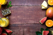 Owoce tropikalne. Asortyment owoców tropikalnych z liści Palm i egzotycznych roślin