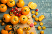 Czerwone i żółte pomidory w starych bowl aluminium na płycie na zewnątrz. Tło pomidory. Ogród warzywny.