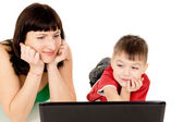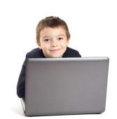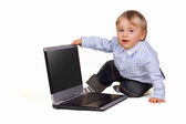 małe dziecko szczęśliwie patrząc na notebook komputer, podnieść