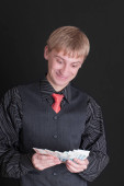 piękny młody człowiek pokazuje, że ma w portfelu jedną lalkę