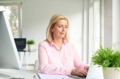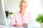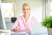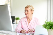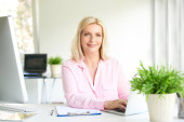 Portret uśmiechający się kobieta siedzi w biurze światła