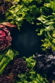Widok z góry radicchio, liście bazylii i zieloną sałatką