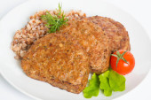 Trzy smażony panierowany kotlet z sałaty, tłuczone ziemniaki i pieprz na białym tle
