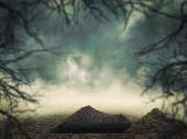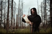 Śmierć w czarnym kapturem i z kosą w lesie. Styl grozy, strachu, straszne zło