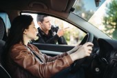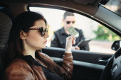 Mężczyzna policjant w mundurze sprawdza, czy licencja kobieta-kierowca. Ochrony prawa, inspektor ruchu samochodu, zadanie kontroli bezpieczeństwa