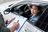 Policjant w mundurze zapisuje grzywny kobieta-kierowca. Ochrony prawa, inspektor ruchu samochodu, zadanie kontroli bezpieczeństwa
