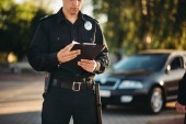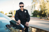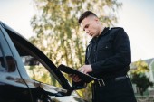 Mężczyzna policjant w mundurze pisze grzywny na drodze. Ochrony prawa, inspektor ruchu samochodu, zadanie kontroli bezpieczeństwa