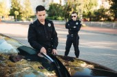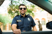 Mężczyzna policjant w mundurze pisze grzywny na drodze. Ochrony prawa, inspektor ruchu samochodu, zadanie kontroli bezpieczeństwa