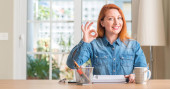 Ruda Kobieta w domu sukces znak robi pozytywny gest ręką, kciuk w górę uśmiechnięty i zadowolony. Patrząc na kamery z wesoły wyrażenie, zwycięzca gest.