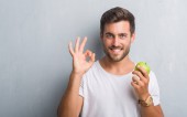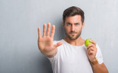 Średnim wieku człowiek jedzenie zdrowe Czerwone jabłko z gniewną twarz, minus Wyświetlono nie lubić z kciuk w dół, odrzucenie koncepcji