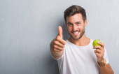Średnim wieku człowiek jedzenie zdrowe Czerwone jabłko robi ok znak palcami, doskonały symbol