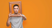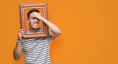 Przystojny młody mężczyzna patrząc przez vintage sztuka ramki poważny wyraz twarzy myślenia o pytanie, bardzo mylić pojęcia