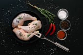 położyć płasko z Turcji i kurczaka nogi na patelnie grill z przyprawami na czarny stół