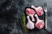 płaskie lay z nogi indyka surowe ziarna pieprzu i soli w patelni z widelec na czarny